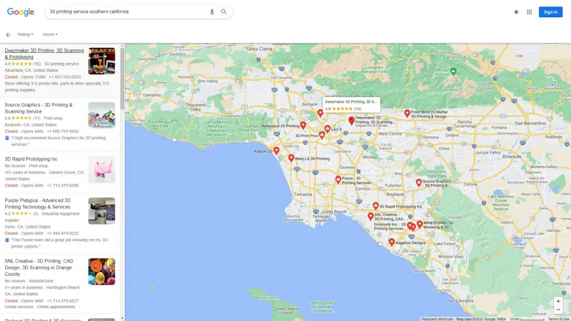Similarly, after entering “3d printing service los angeles” in the Google browser, the search results are as follows: