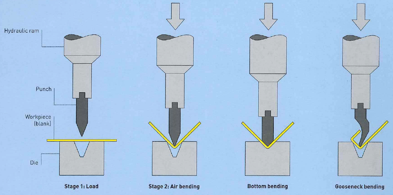 Press brakes are fundamental to low to medium volume metalwork. When combined with cutting and joining equipment, press brakes are capable of producing a range of products including continuous, bend and sheet geometries. They tend to be manually operated and are used for one-off, low volume and batch production up to 5,000 units. Pressure is applied by a hydraulic ram, which forces the metal to bend along a single axis between a punch and die. There are many standard punches and dies, which are used to produce a range of bends with different angles and circumferences, but always in a straight line.